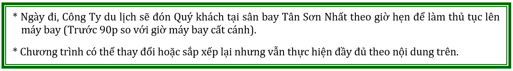 Thứ tự các điểm tham quan trong chương trình có thể thay đổi cho phù hợp với tình hình thực tế. Nhưng không hủy bỏ hoặc thay đổi mà không có sự thỏa thuận với Đoàn.