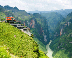 Qúy khách dừng chân ngắm cảnh đèo Mã Phì Lèng, một trong “Tứ Đại Đèo” nổi tiếng nước ta, là đoạn đẹp nhất trên con đường mang tên "Đường Hạnh phúc". Chụp hình với vẻ đẹp hùng vĩ của hẻm vực Mã Pì Lèng sâu 800m - nơi địa hình bị chia cắt sâu nhất của Việt Nam. Quý khách đi xe ôm xuống bến thuyền quý khách lên thuyền ngắm cảnh sông Nho Quế và hẻm vực Tu Sản khoảng 1 tiếng . (Phí thuyền và xe tự túc nếu điều kiện thời tiết tốt)